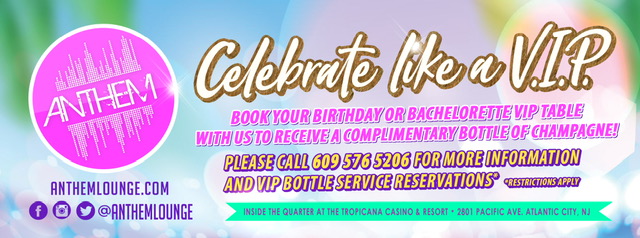 Anthem is a Vegas-style themed nightclub that integrates the feel and ambiance of a Miami style dance club. Giving you a visually stimulating experience with for an intimate concept in nightlife, ANTHEMS will be played from 10 PM until the sun rises. Anthem Nightclub in Atlantic City provides a creative concept and has a strong presence with delivering a personal touch on customer service and music. The founders are longtime AC nightlife residents Carrie Washington and Lambros Tsikouras, who both managed the same space when it was named 32º Luxe Lounge. Carrie and Lambros' goal is to focus the energy on being one that never settles down, even at 4 AM while every nightclub in Atlantic City has their doors closing, Anthem continues. Contact us now and join the ANTHEMS as we keep the volume and party going inside The Quarter of the Tropicana Casino & Resort in Atlantic City, NJ. Bottle Service packages and reservations are available now by calling 609-576-5206. Birthday, Bachelorette and Private Party packages are also available alongside Catering services located in the Quarter of the Tropicana Casino & Resort in Atlantic City. Anthem is a 21 and over establishment during normal business hours.